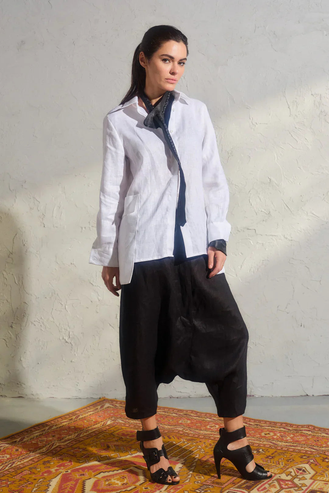 Don’t wear your linen shirt — build around it. Pair an oversized asymmetric linen blouse with wide-leg architectural trousers or a sharply cut midi skirt. Let volume meet volume. Think structure, not softness.