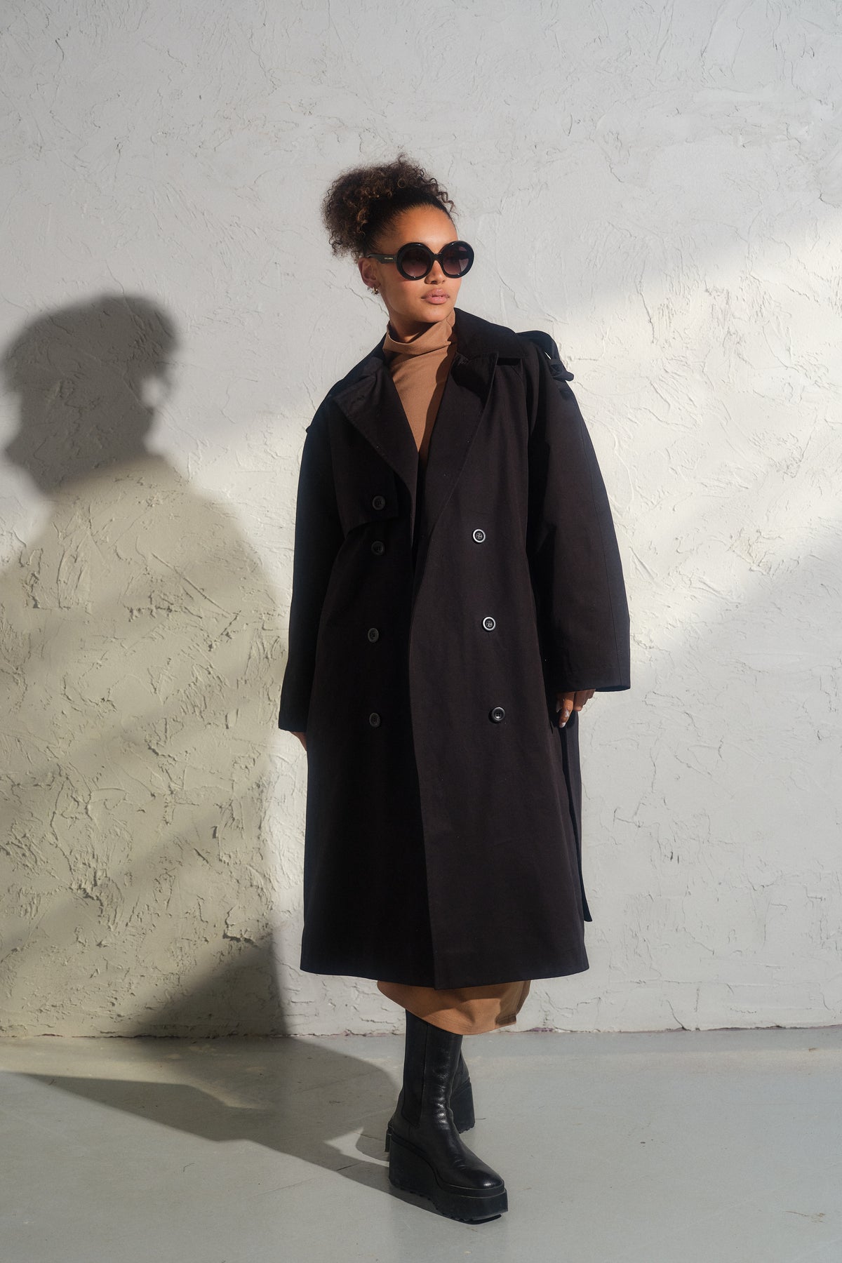 With its classic long, straight silhouette and modern oversized fit, this piece blends heritage design with a contemporary edge. Featuring a wide lapel collar, double-breasted front, detachable belt, side pockets, and long sleeves, it’s an effortlessly elegant staple you'll wear again and again.