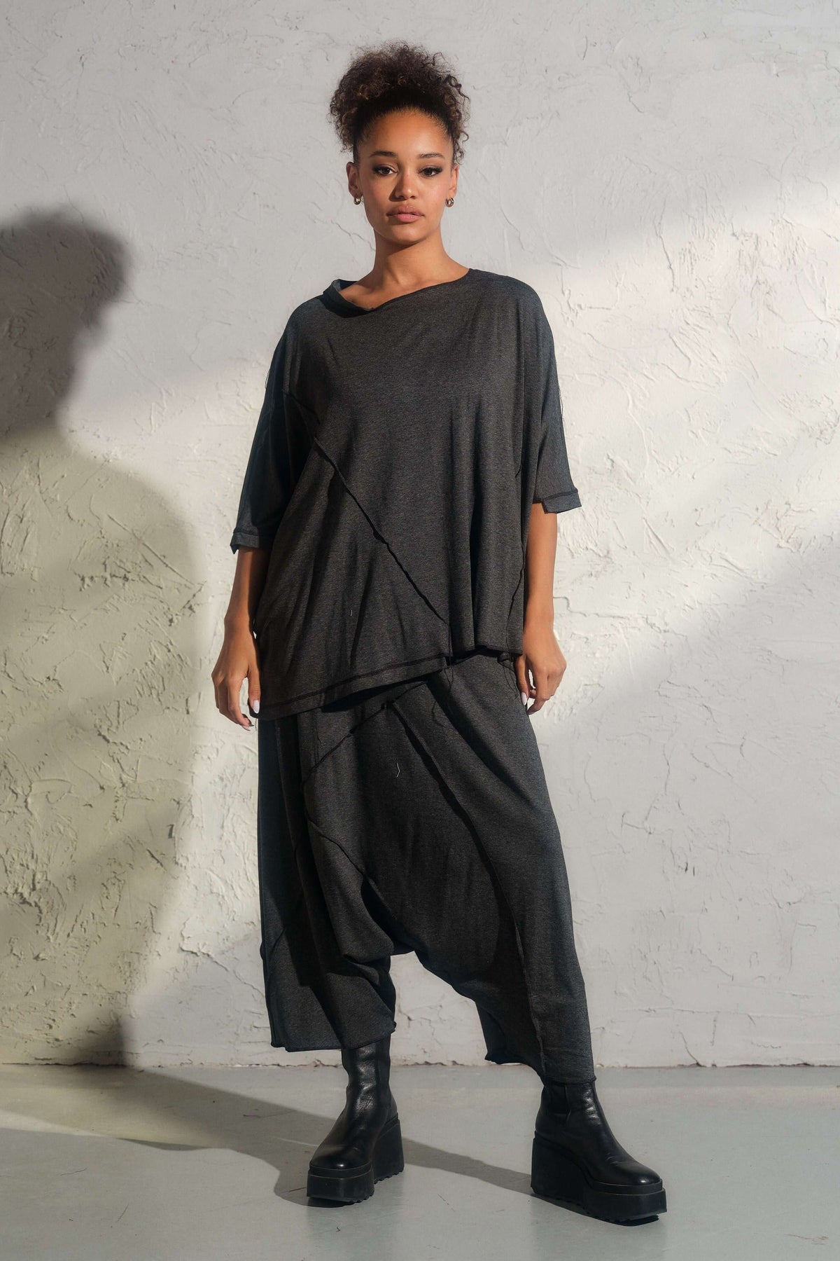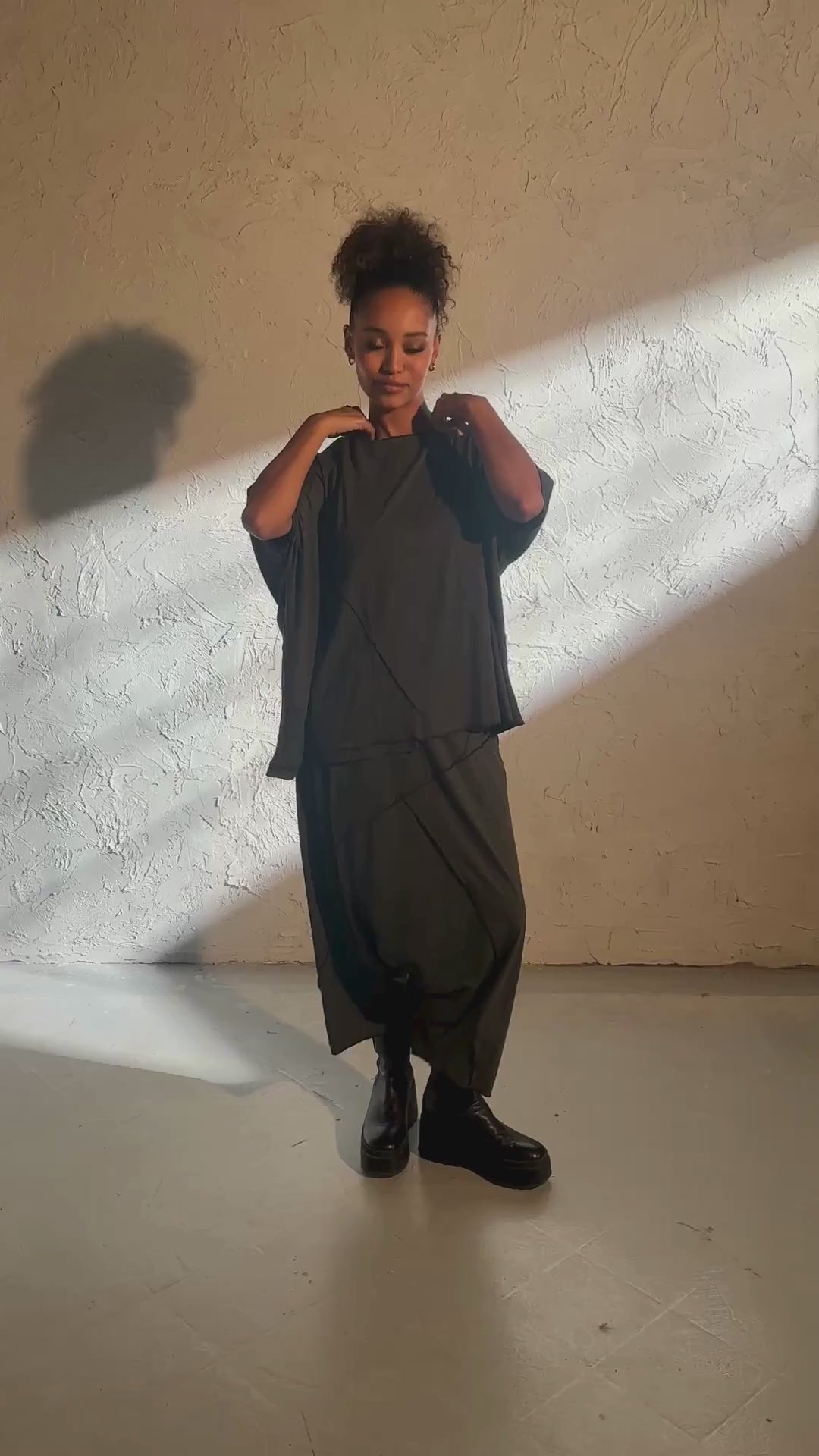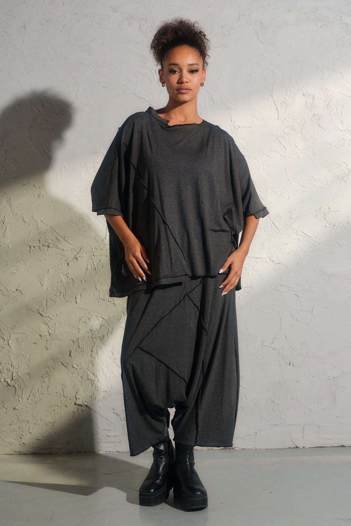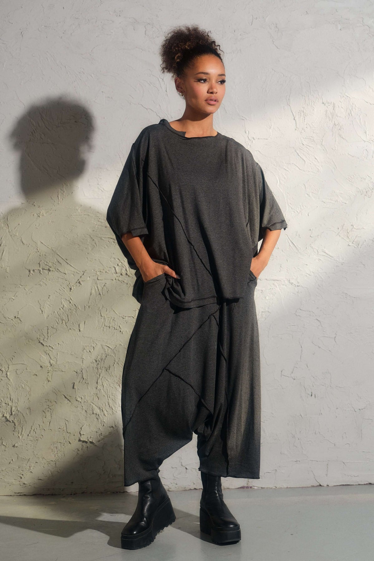 Crafted with care, it features a relaxed fit that drapes gracefully, ensuring comfort and sophistication. The asymmetric design adds an edgy flair, while the short sleeves provide a touch of elegance.