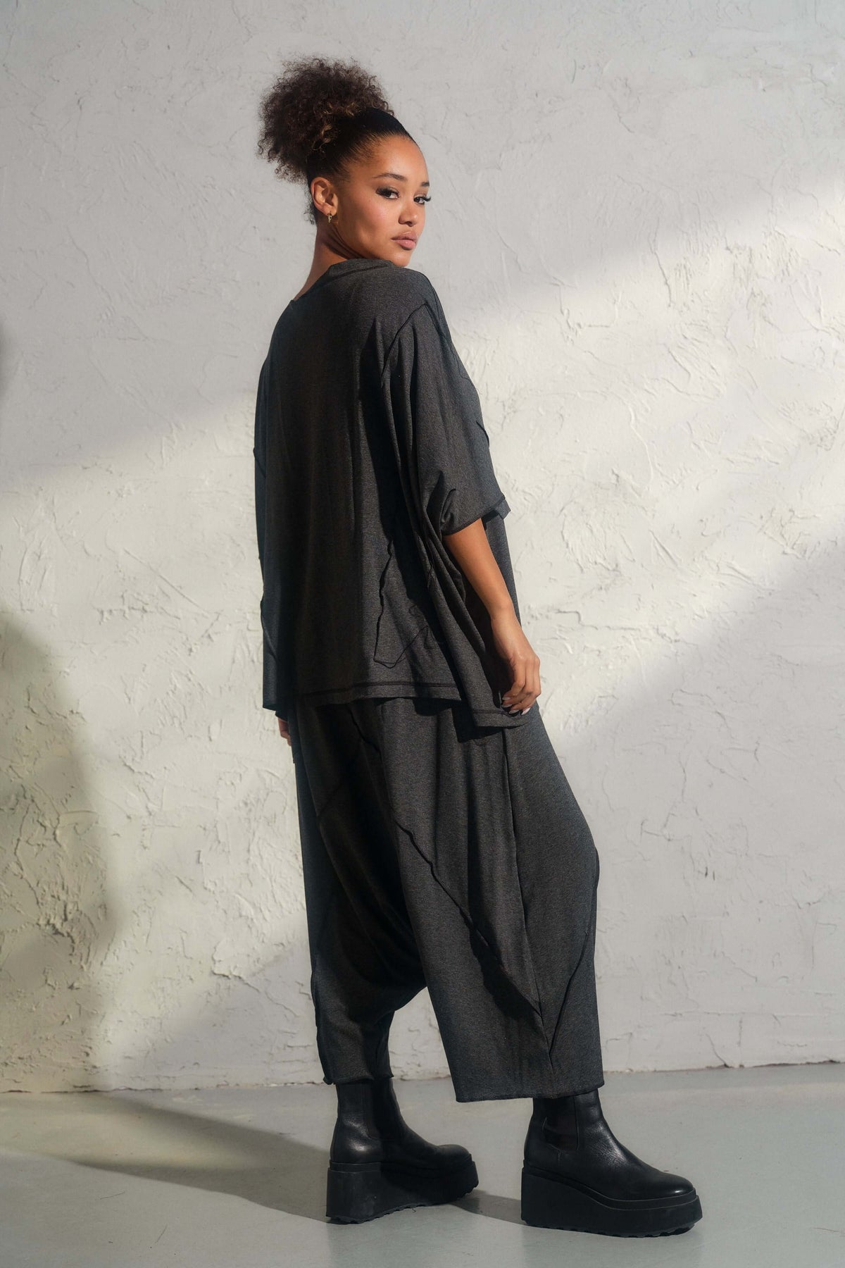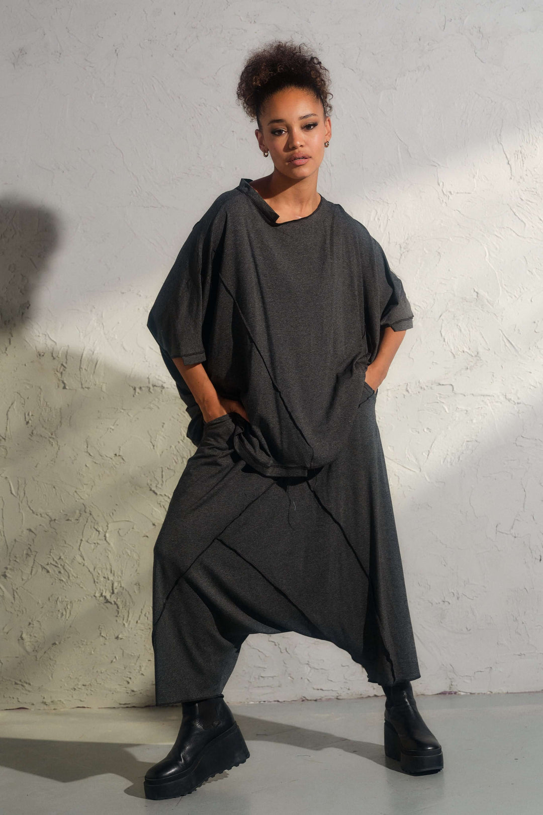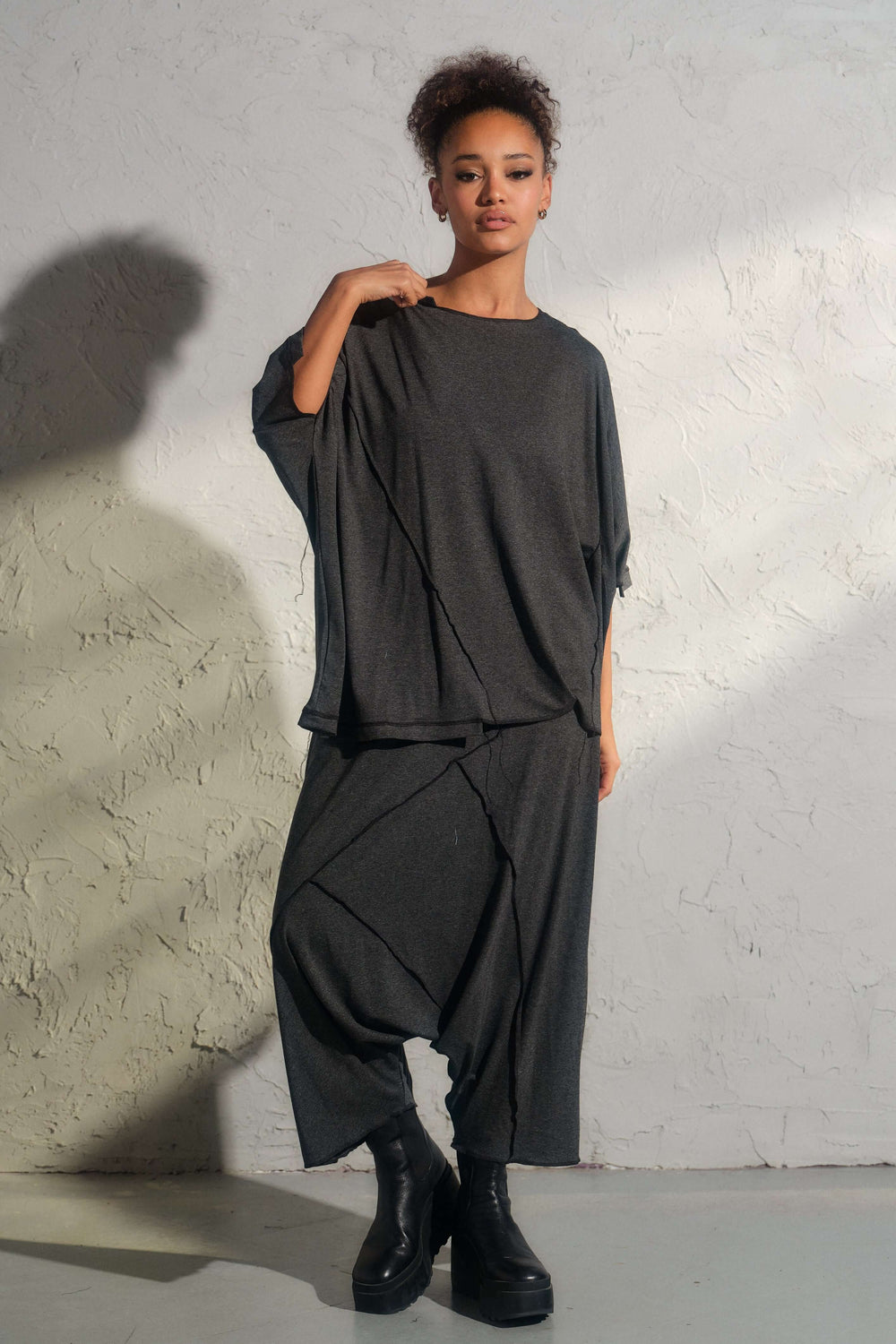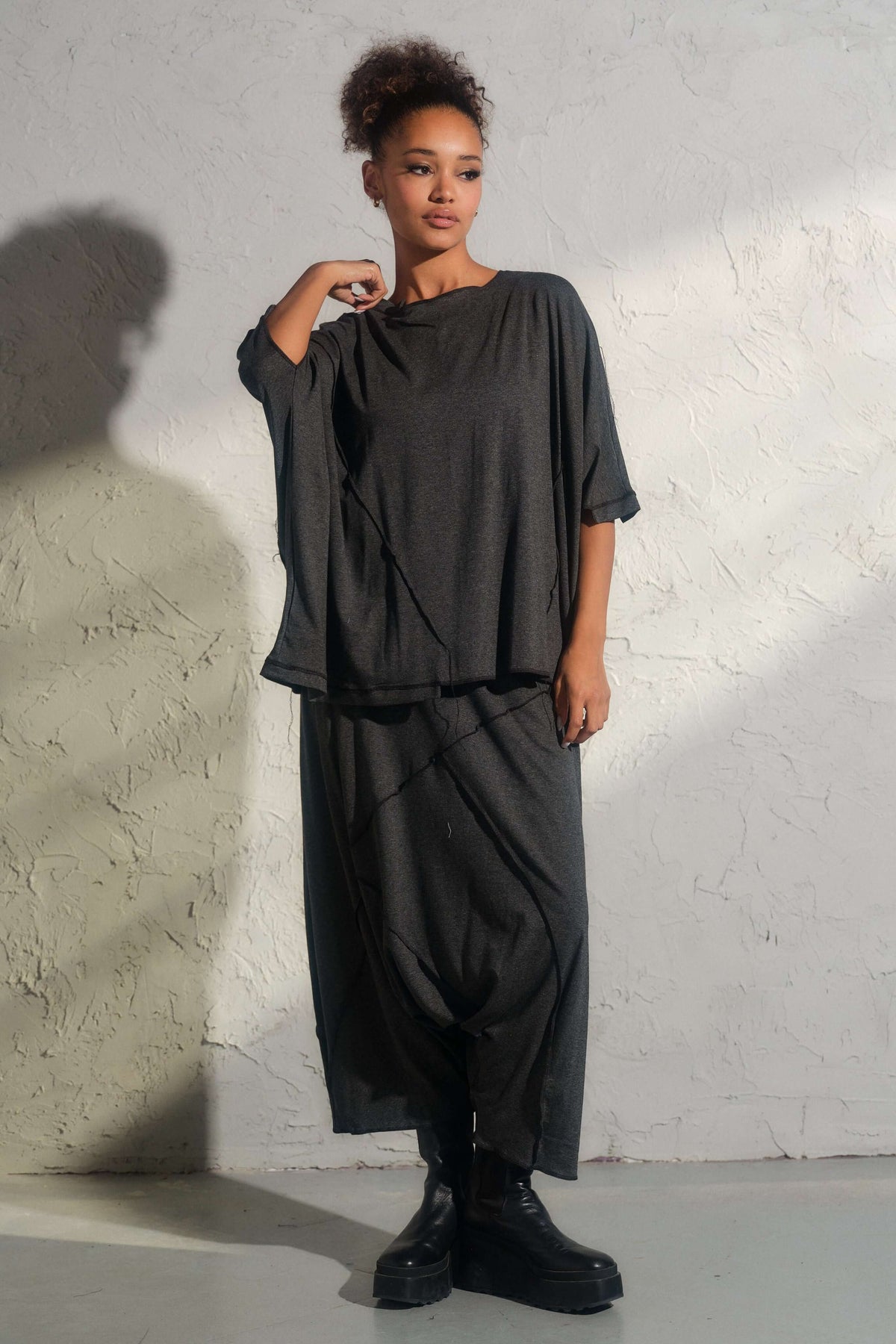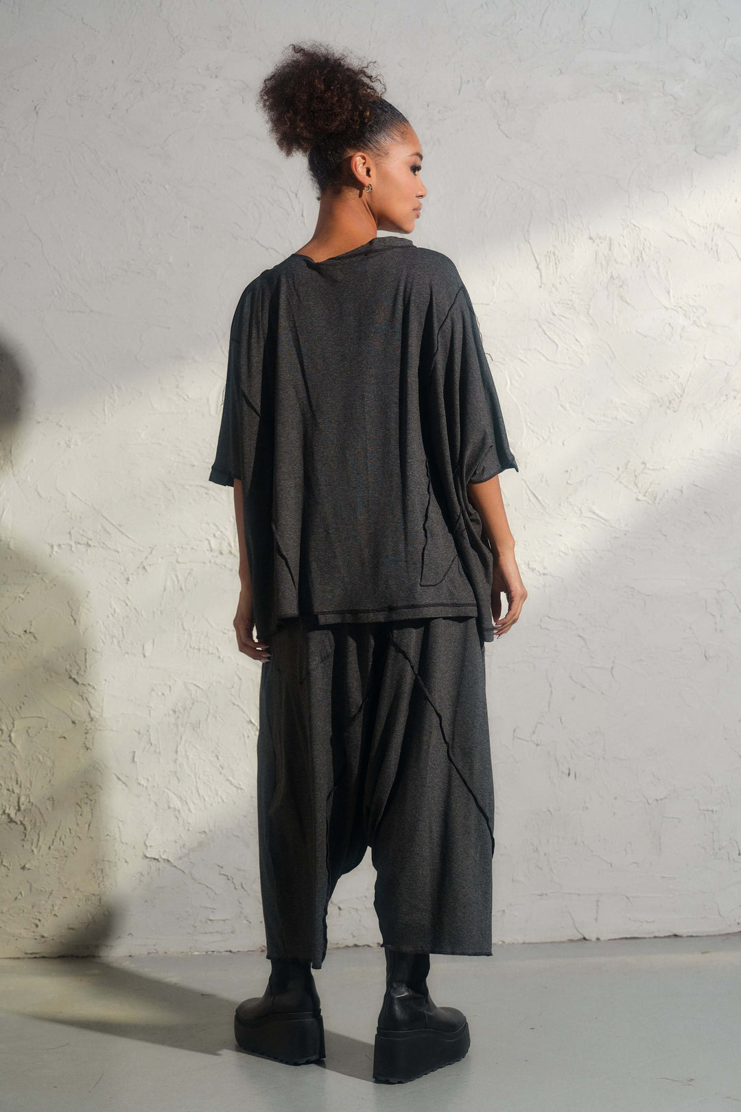 Crafted with care, it features a relaxed fit that drapes gracefully, ensuring comfort and sophistication. The asymmetric design adds an edgy flair, while the short sleeves provide a touch of elegance.