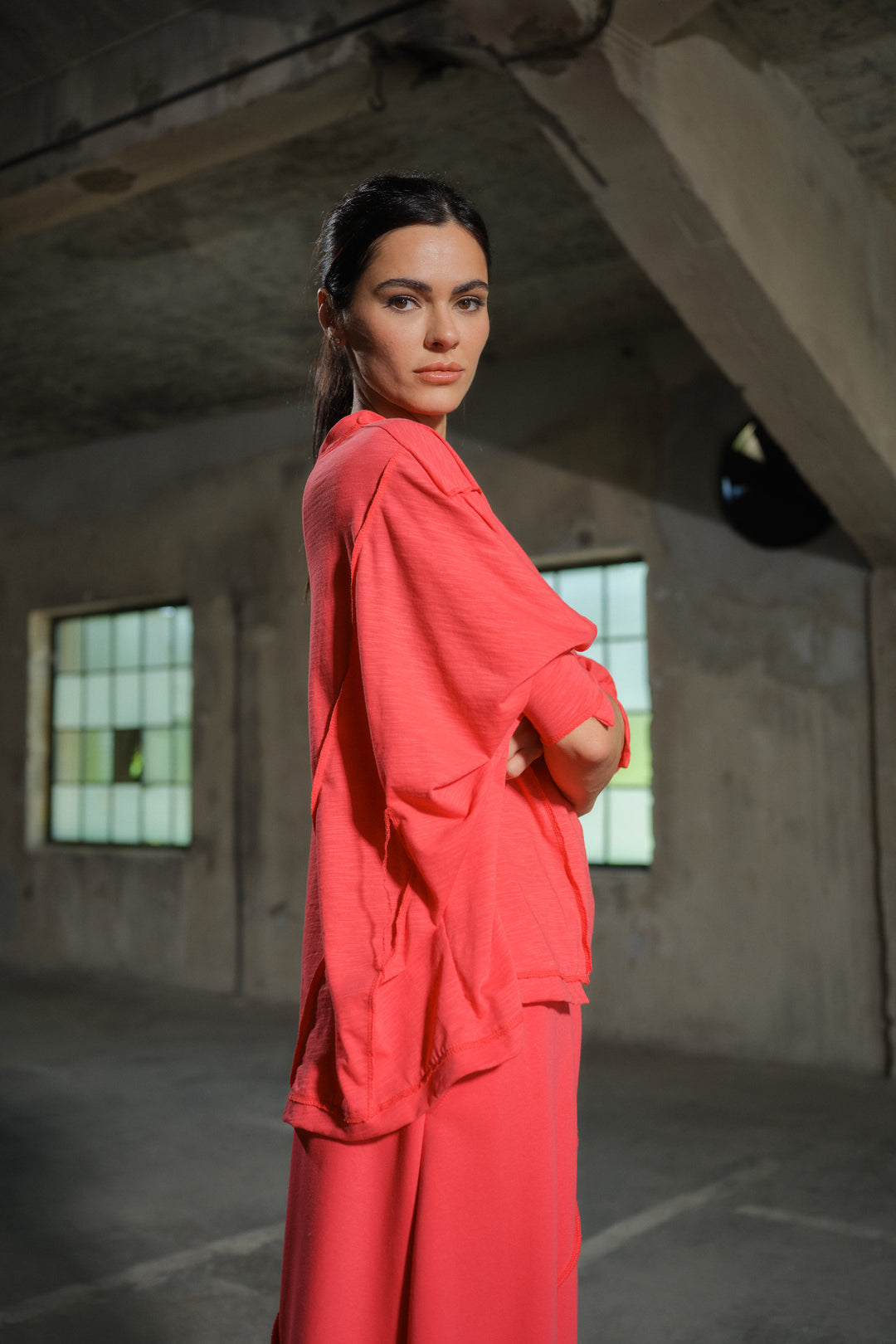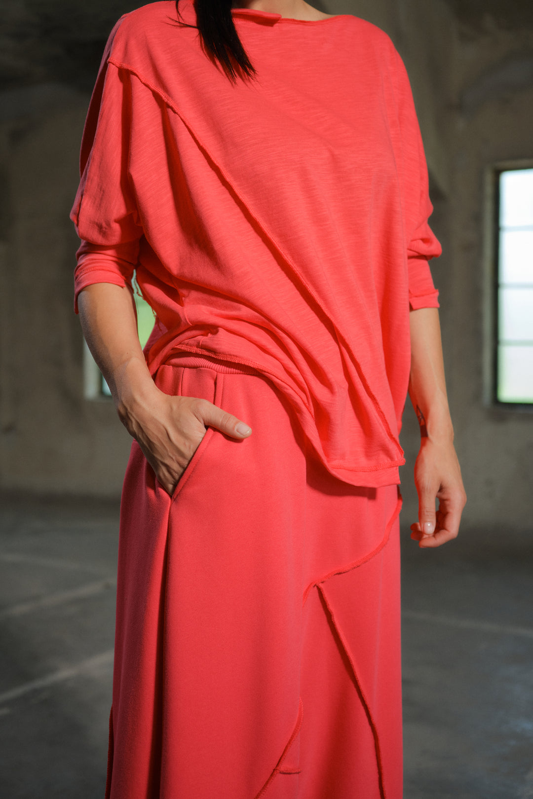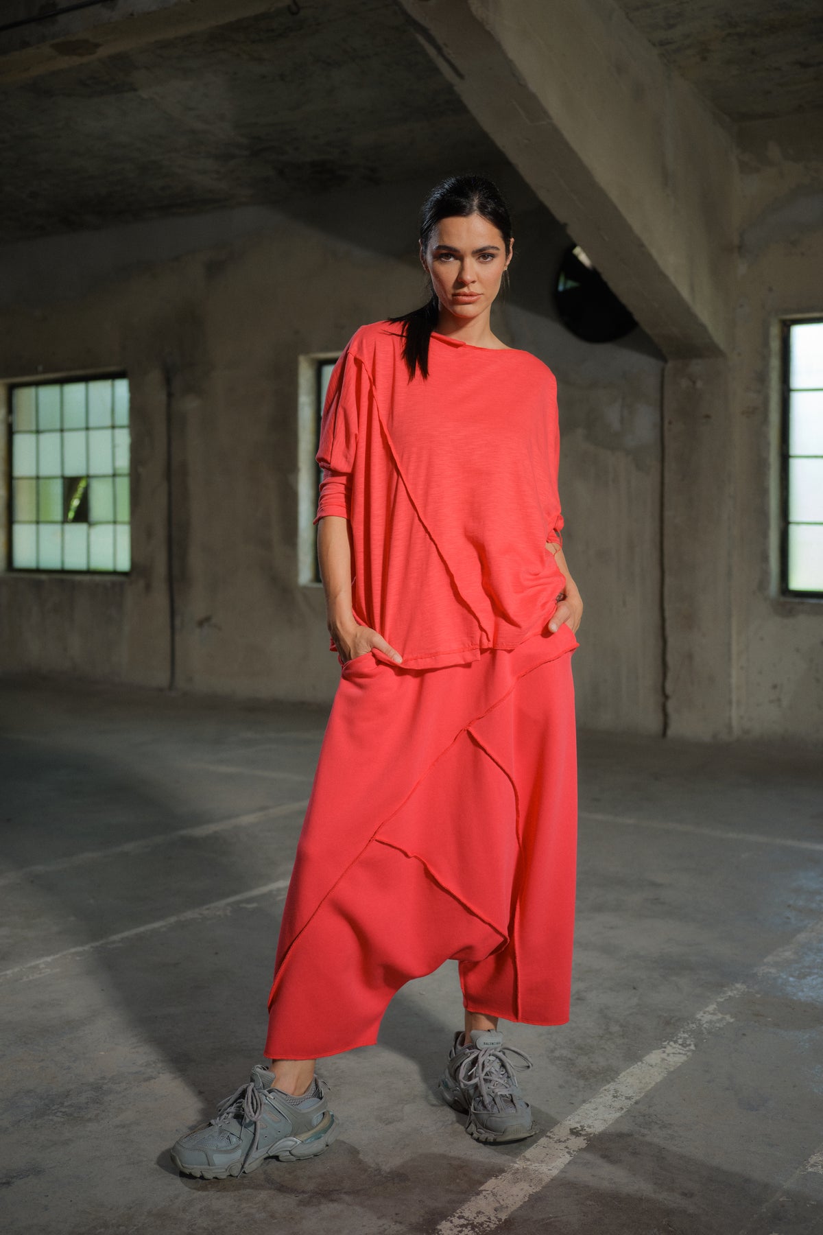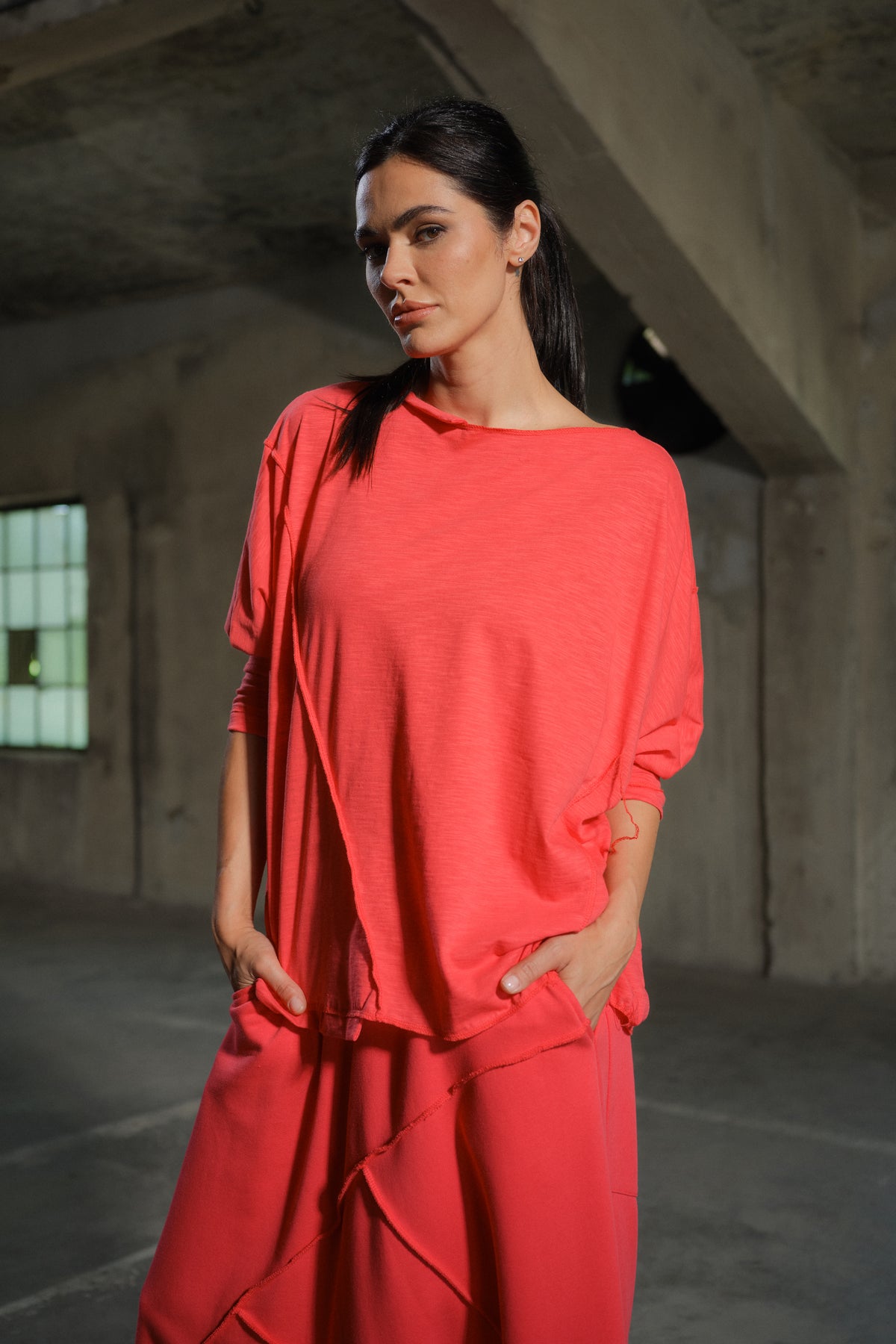 Introducing our asymmetrical viscose top – an avant-garde masterpiece blending artistic innovation with effortless style. Adorned with exquisite overlock decorations, this unique garment is a true statement piece.
