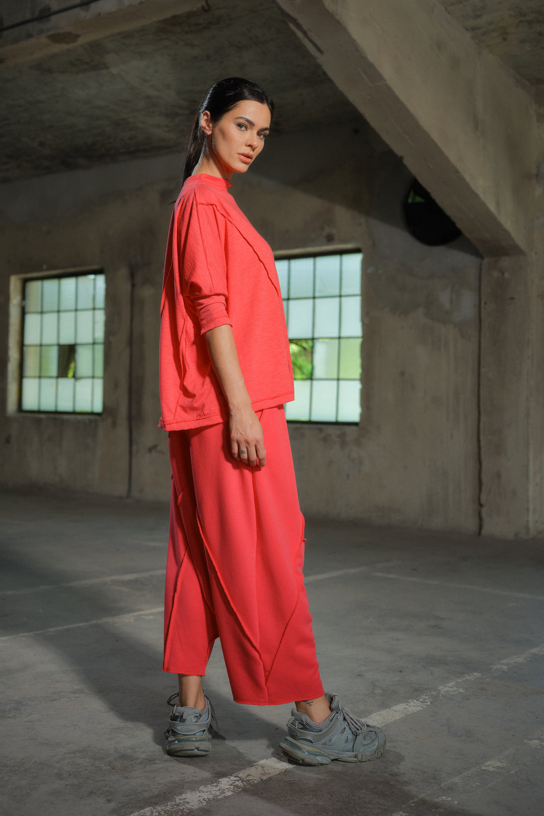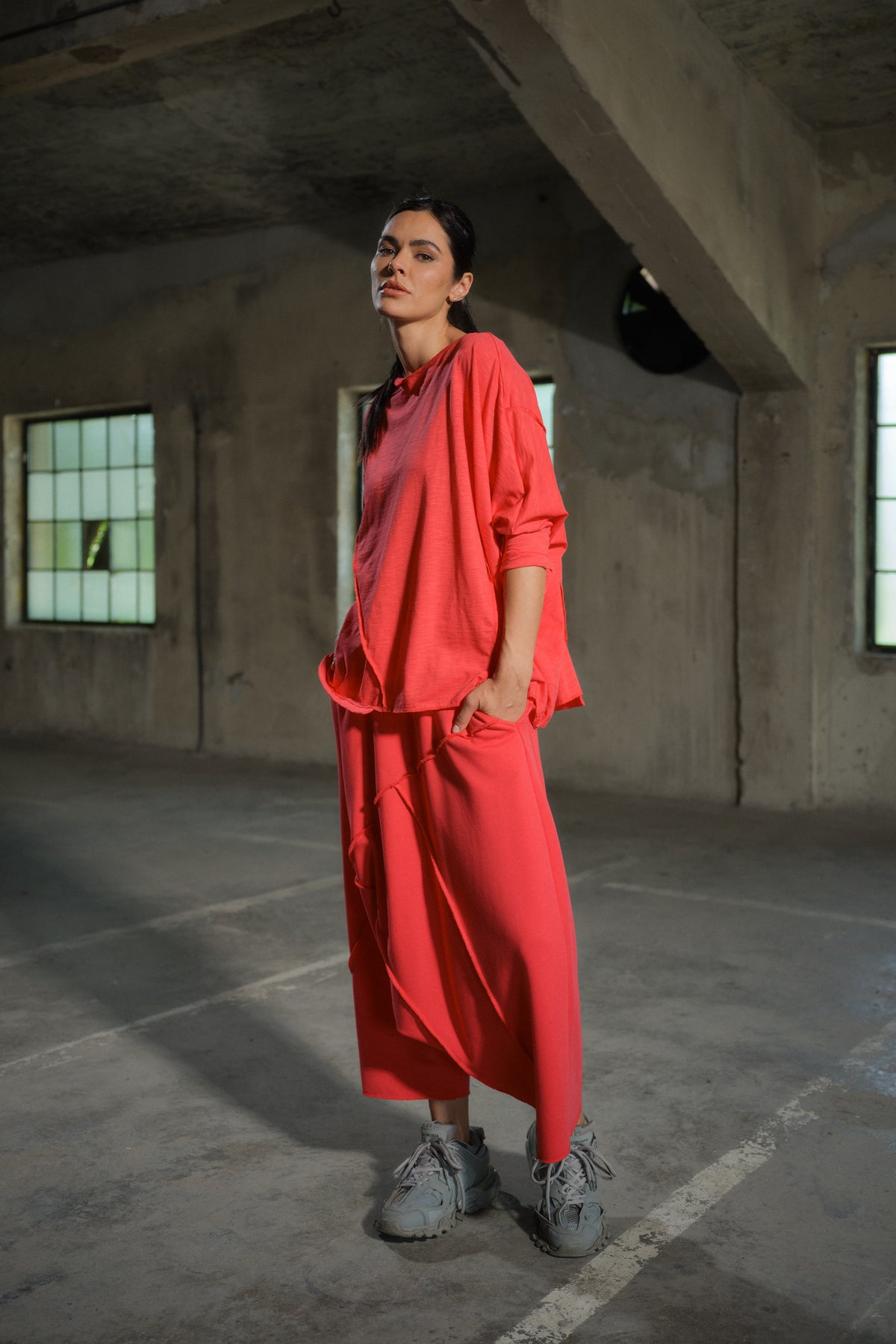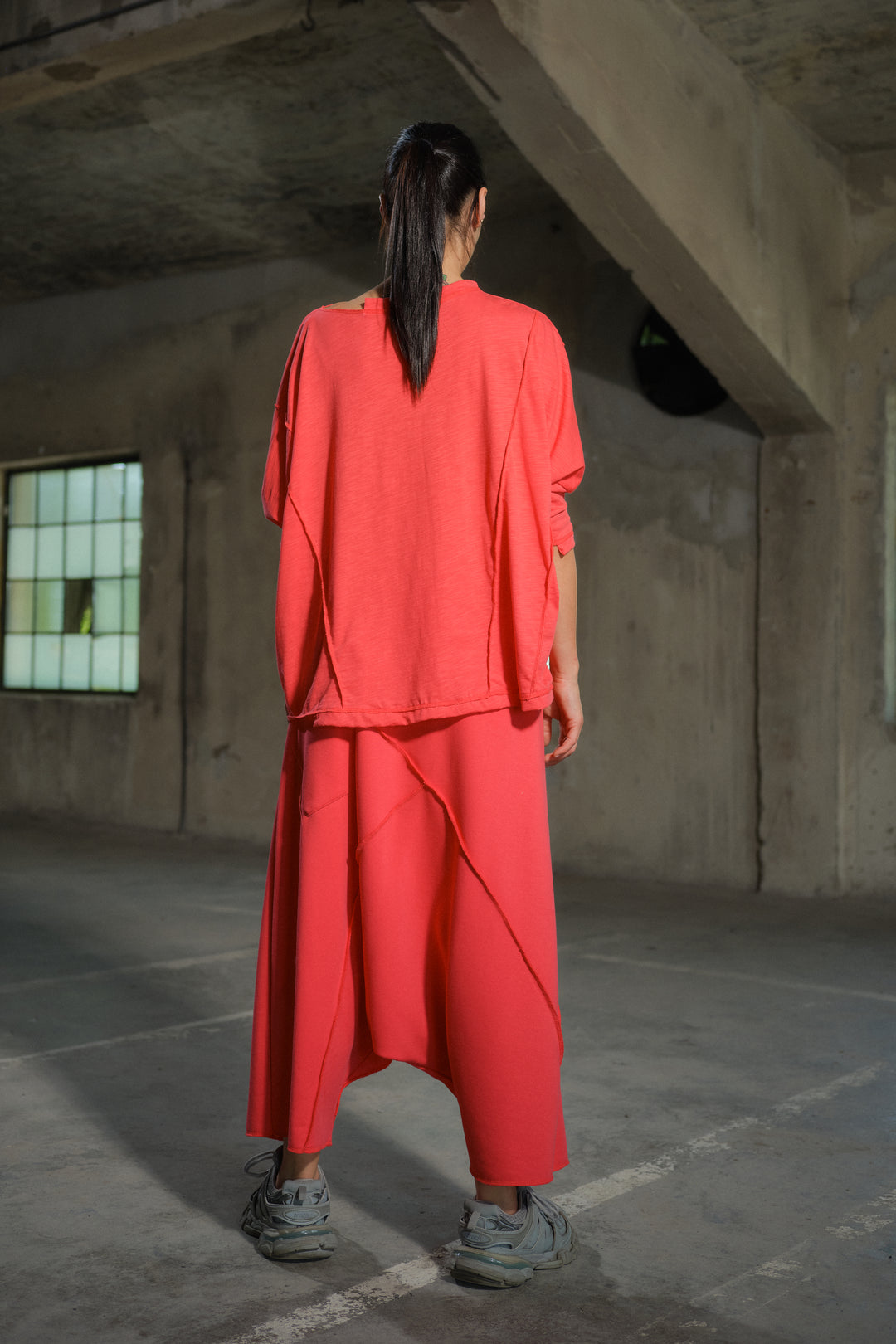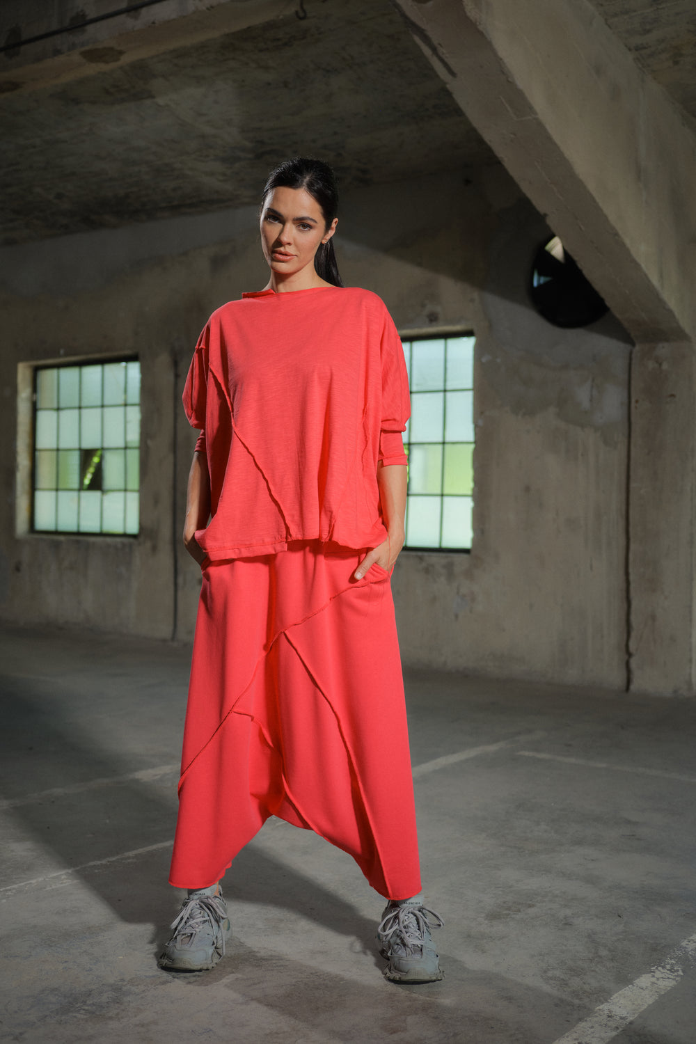 Introducing our asymmetrical viscose top – an avant-garde masterpiece blending artistic innovation with effortless style. Adorned with exquisite overlock decorations, this unique garment is a true statement piece.
