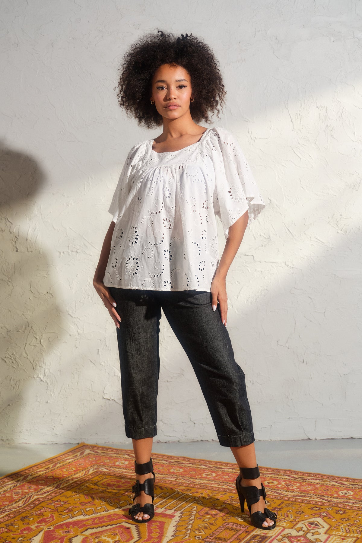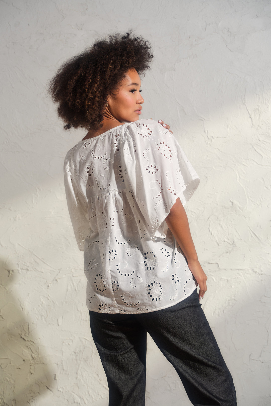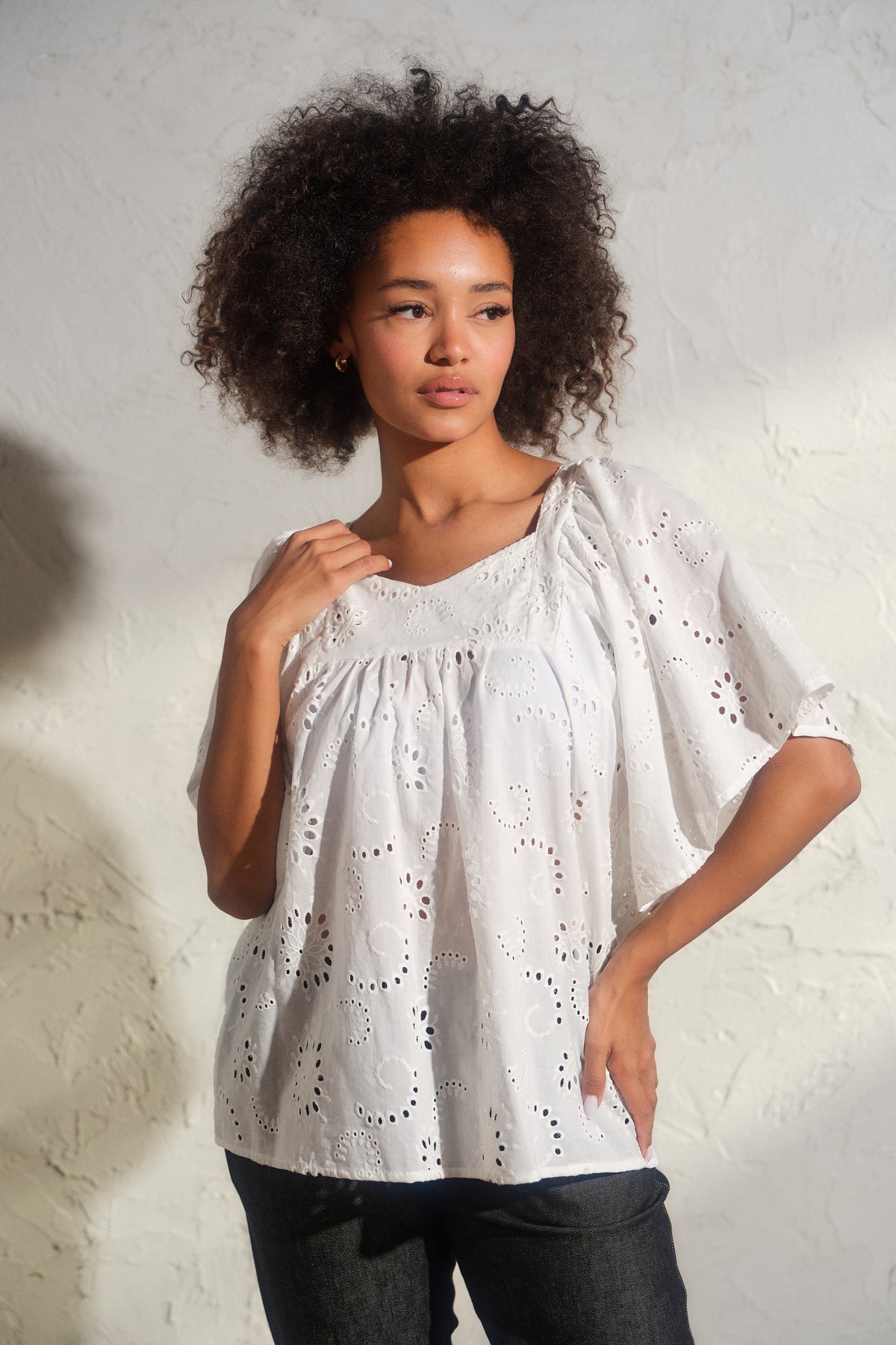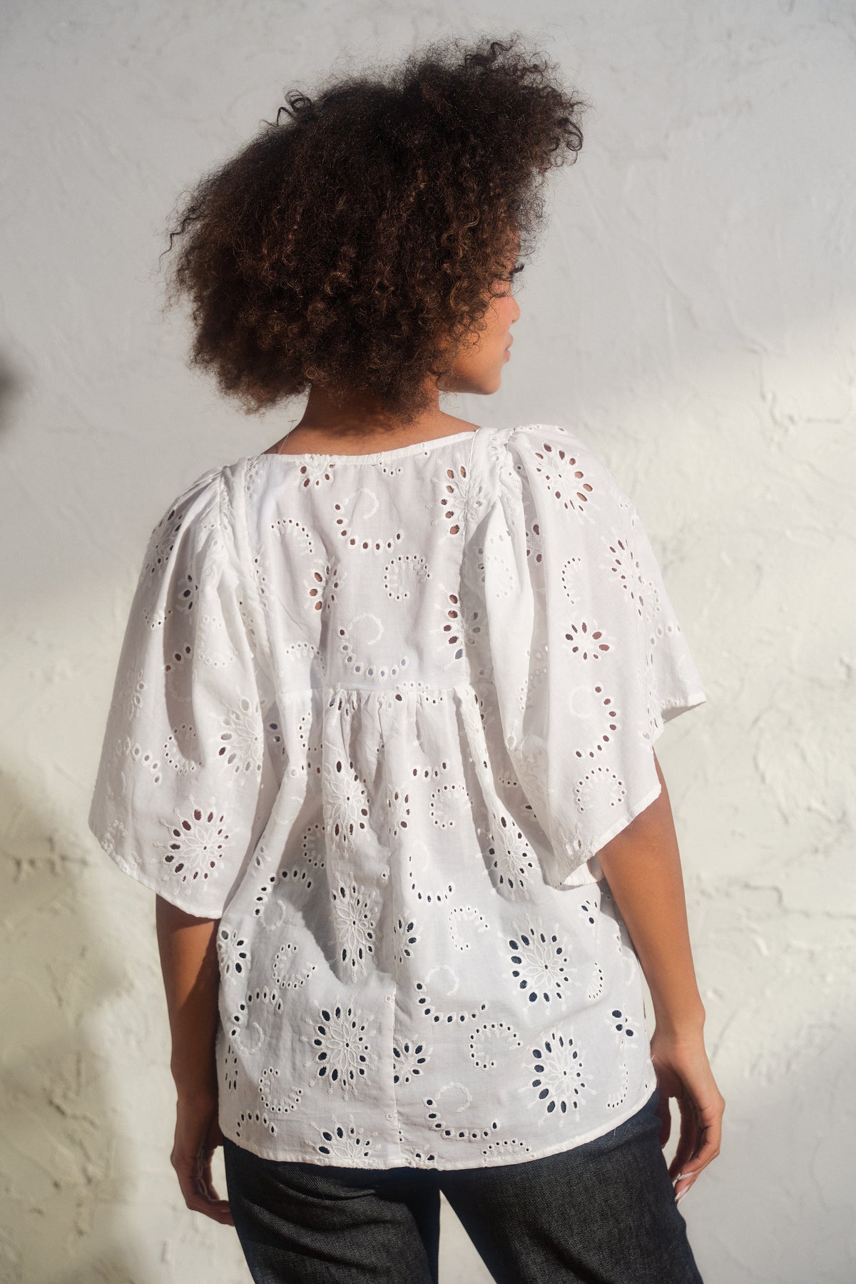 Romantic White Cotton Blouse with Ruffle Sleeves & Cut Embroidery – Feminine, Breezy, and Effortlessly Charming