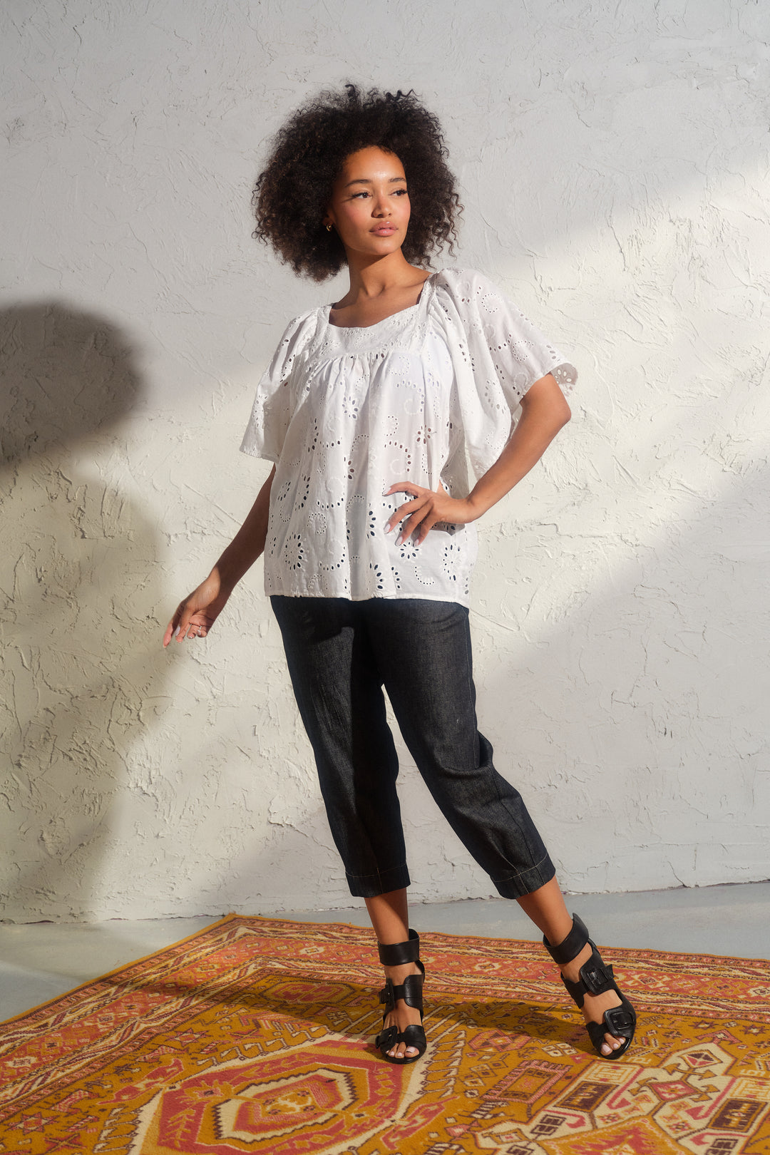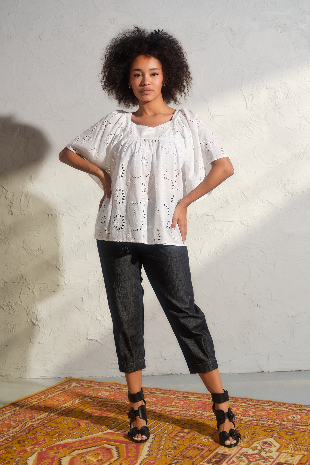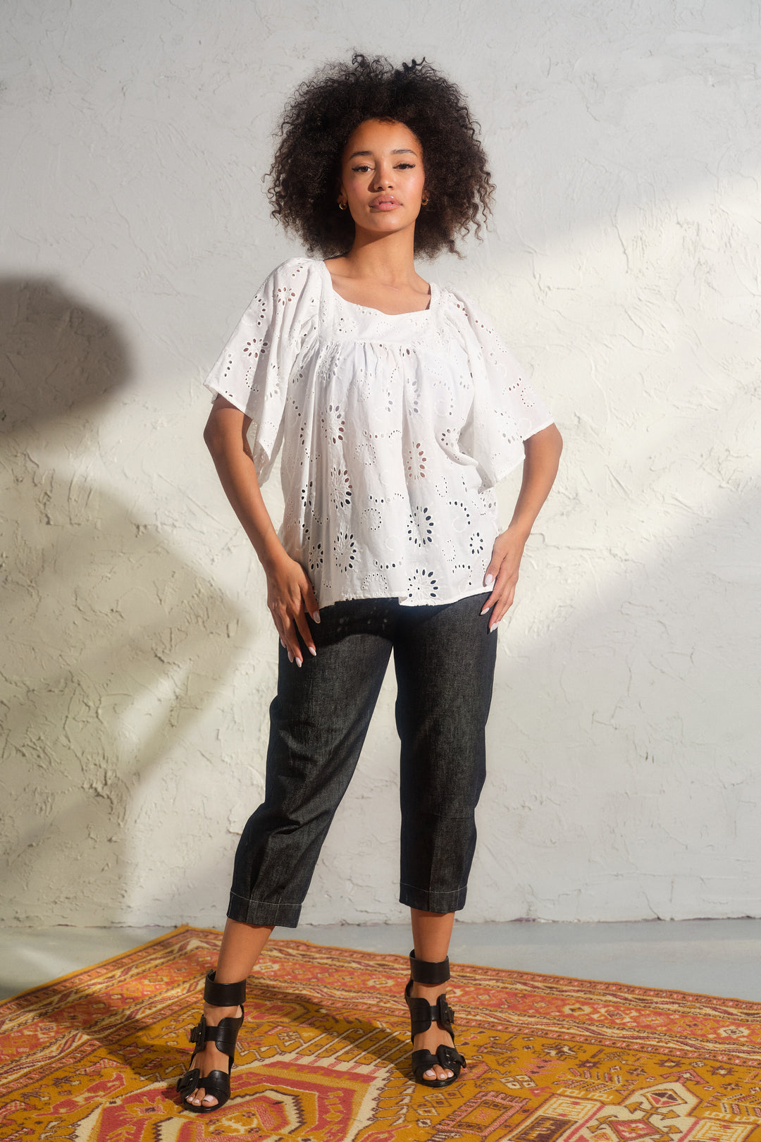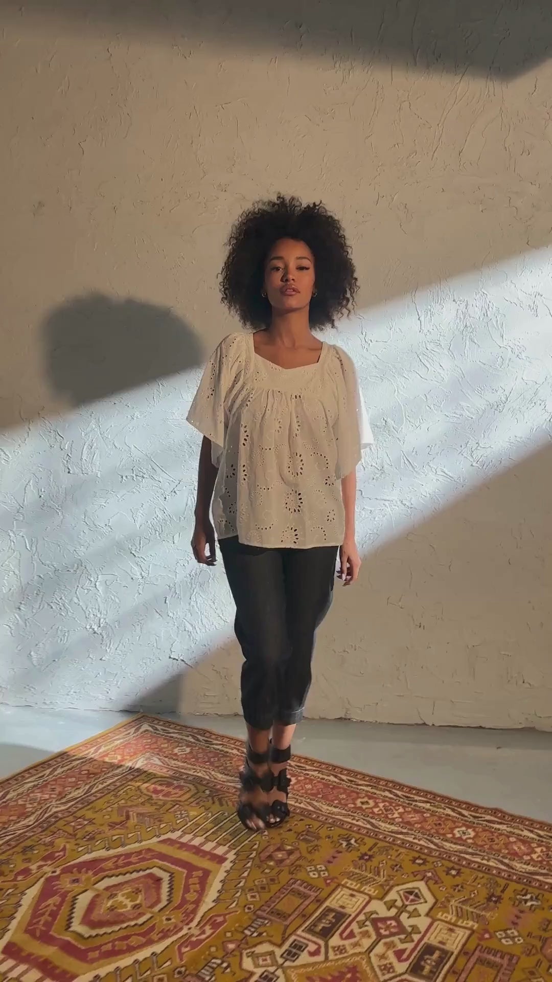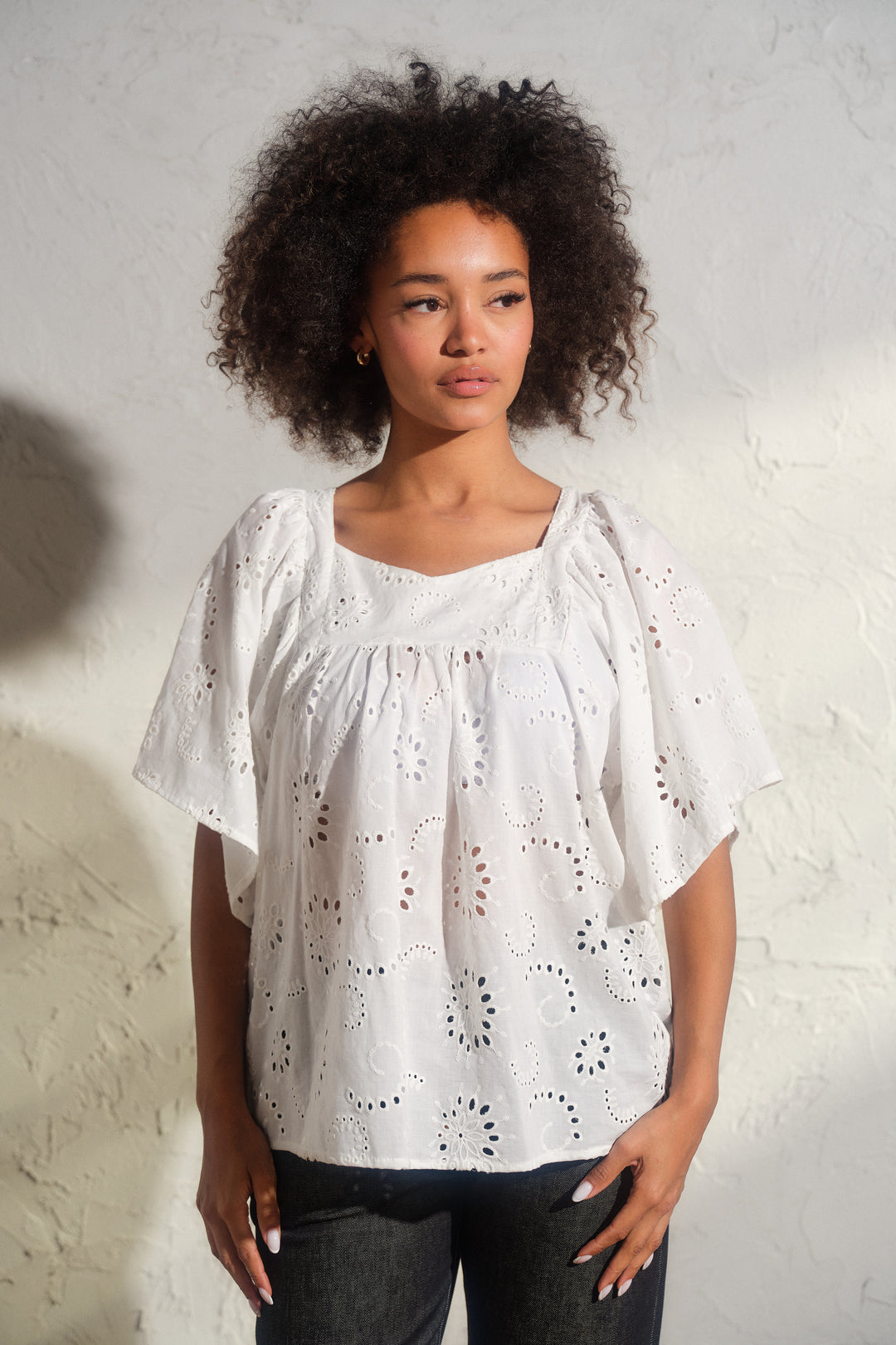 The blouse features exaggerated ruffle sleeves, a sweet square neckline, and a loose, relaxed fit that moves beautifully with the body. The overhead pullover design adds to its easygoing charm, while the embroidery adds a subtle touch of sophistication and feminine allure.