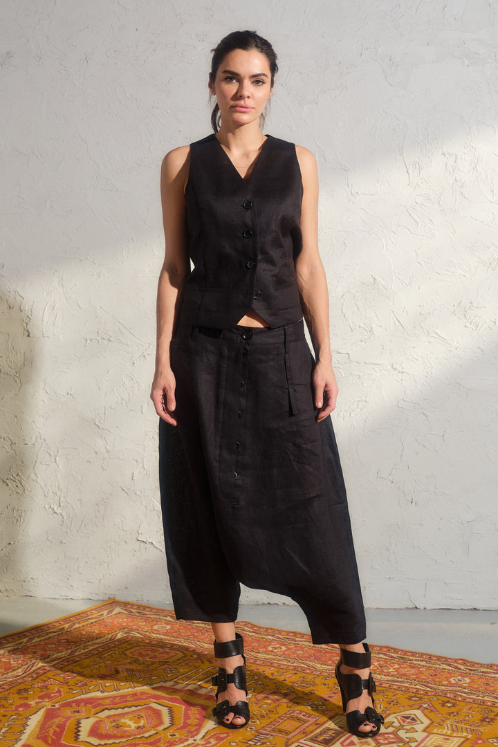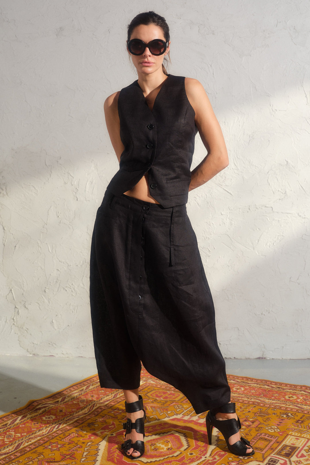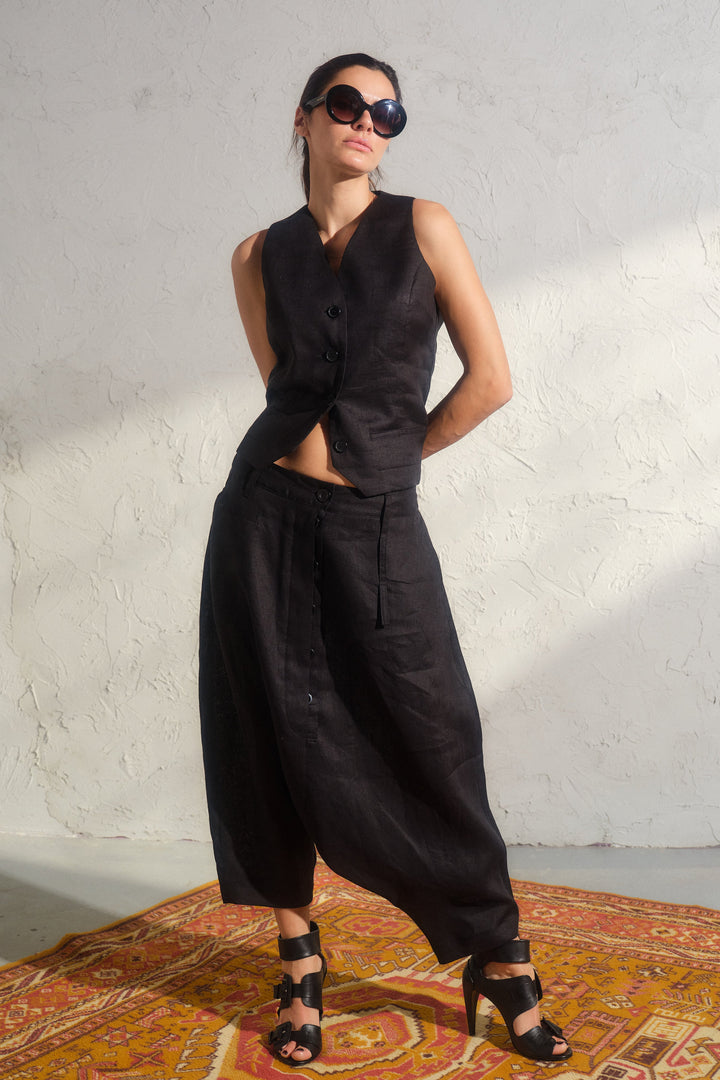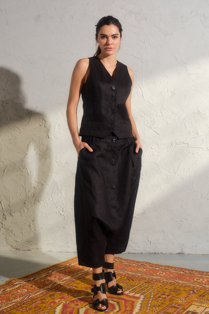 With its gentle tailoring, front button closure, and two subtle pockets, this vest offers a look that’s polished yet free-spirited. The lightweight feel and breathable fabric make it an ideal piece for layering through every season.