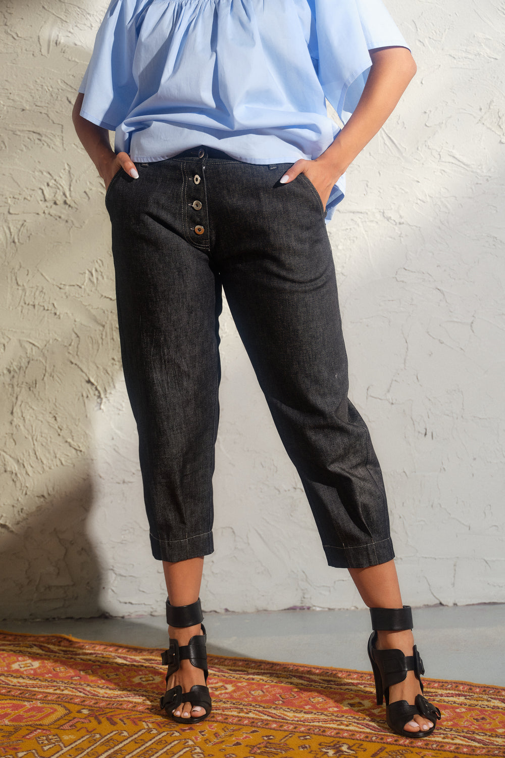 Featuring a mid-rise waist, button-front closure, and functional side pockets, these jeans blend classic design with a modern edge. The carrot-cut silhouette gently tapers into a cropped above-the-ankle length, creating a flattering fit that works beautifully with both casual and elevated looks.